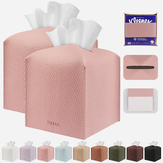 PARIERIS Tissue Box Cover Holder Square Tissue Cube Cover PU Leather Tissue Organizer with Bottom Belt for Bathroom Tabletop Car Night Stands Office Home Kitchen (2 Pink)