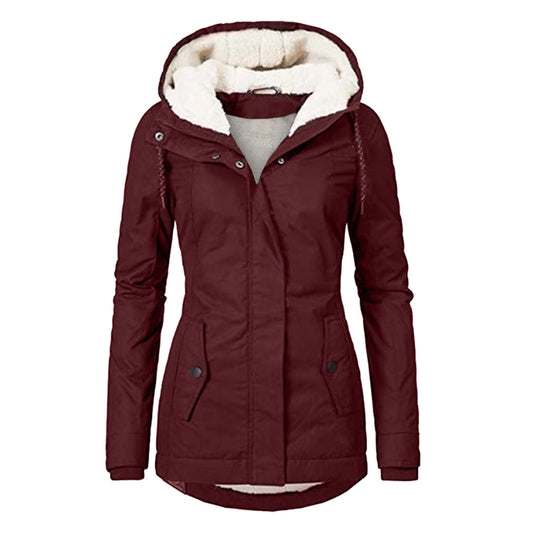 Winter Hooded Jacket Solid Color Warm Buckle Zip-up Fleece Jacket With Pockets Women's Casual Jacket