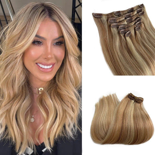 Clip in Hair Extensions Remy Human Hair Golden Brown and Blonde Balayage Human Hair Clip in Extensions 12 Inch Thick Full Real Hair Extensions Bleach Blonde Highlight Golden Brown Clip ins 70G 7PCS