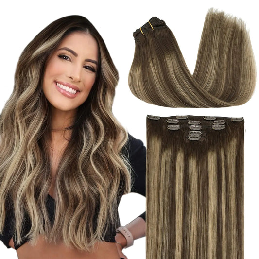 DOORES Clip in Hair Extensions Human Hair 5pcs 75g Balayage Chocolate Brown to Honey Blonde 14 Inch Real Human Hair Extensions Clip in Remy Hair Extensions Silky Straight