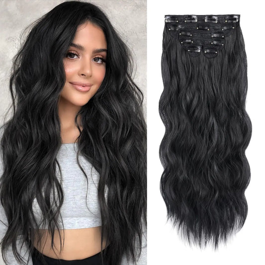 WECAN Clip In Natural Black Hair Extensions 20 Inch 6pcs Thick Curly Clip In Hair Extensions Synthetic Double Weft Wavy Hairpieces Full Head For Women