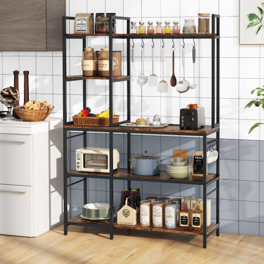 5-Tier Bakers Rack with Power Outlets and 10 S-Shaped Hooks-Rustic Brown