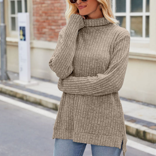 High Collar Loose Long Sleeve Split T-shirt Top For Women