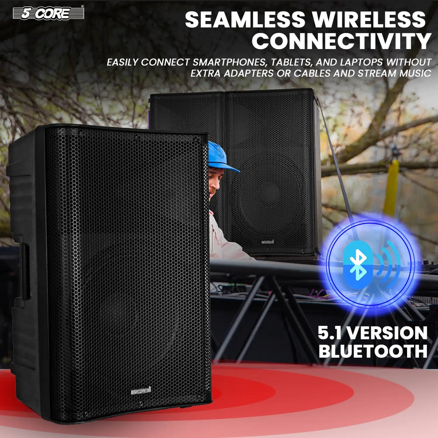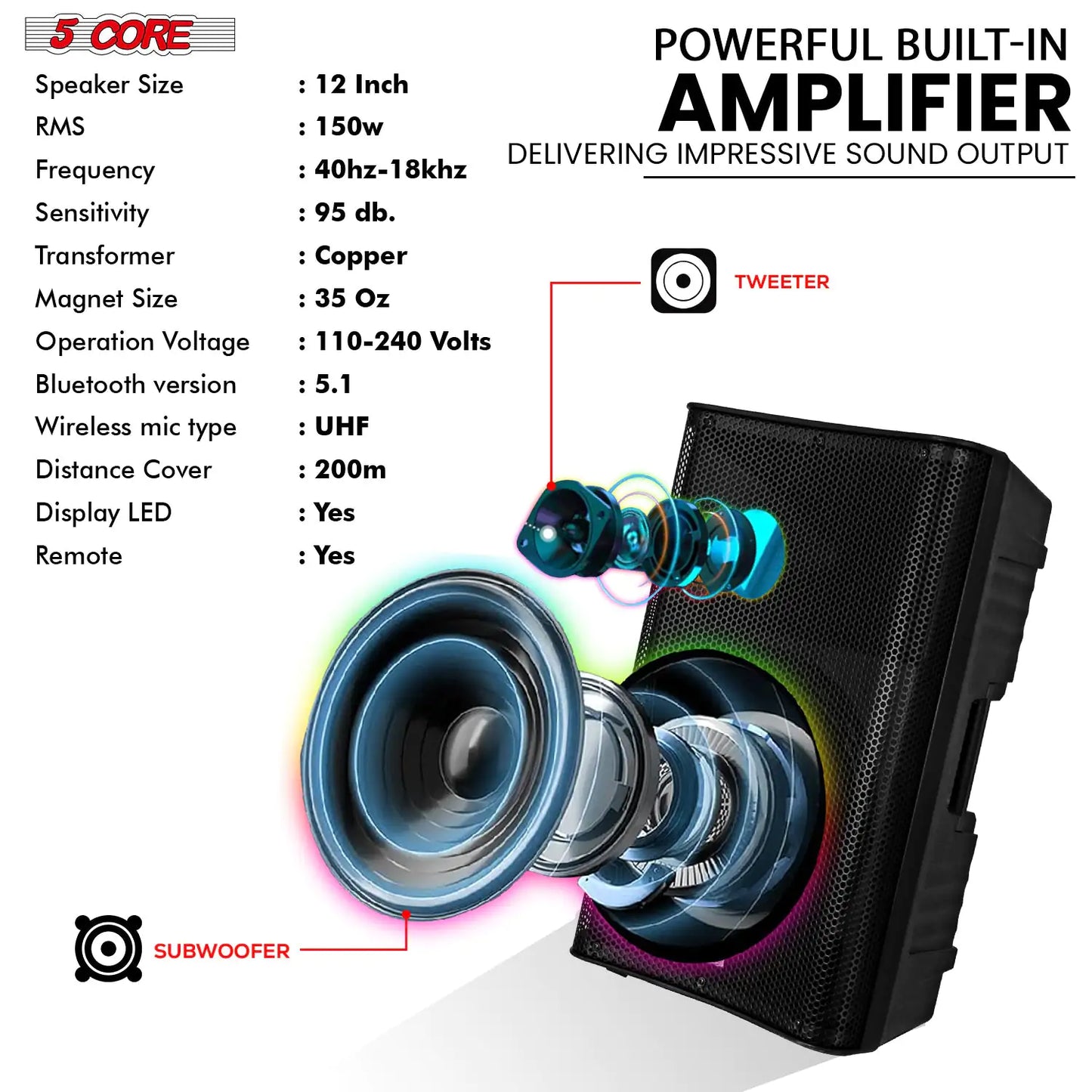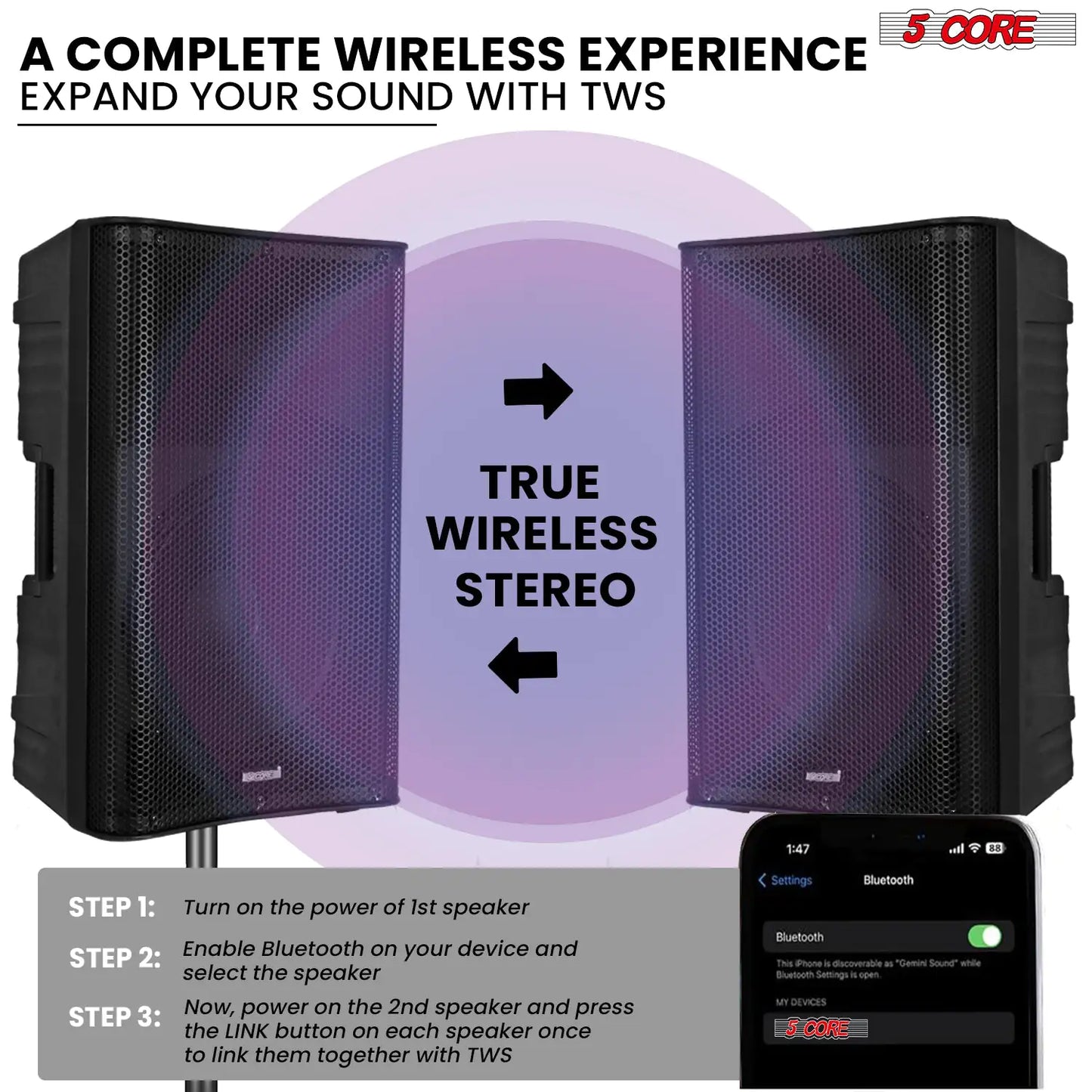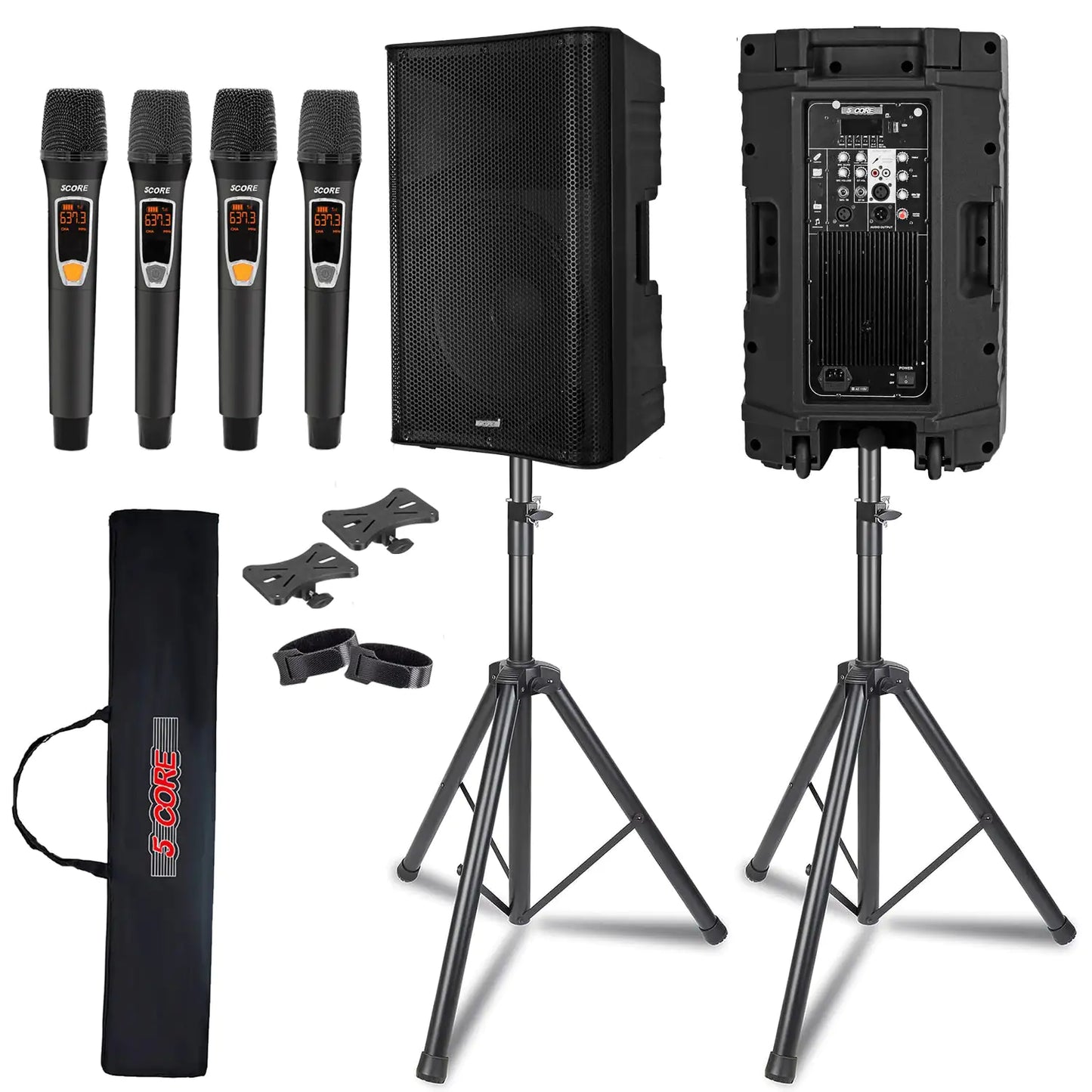5 Core 12 Inch Professional 3000W Powered PA System Pair 2 Way TWS Bluetooth Speaker +4 Wireless UHF Mics +2 Stand +2 Bags XLR in/Out Active Preamp Outdoor Sound Set for DJ Party
