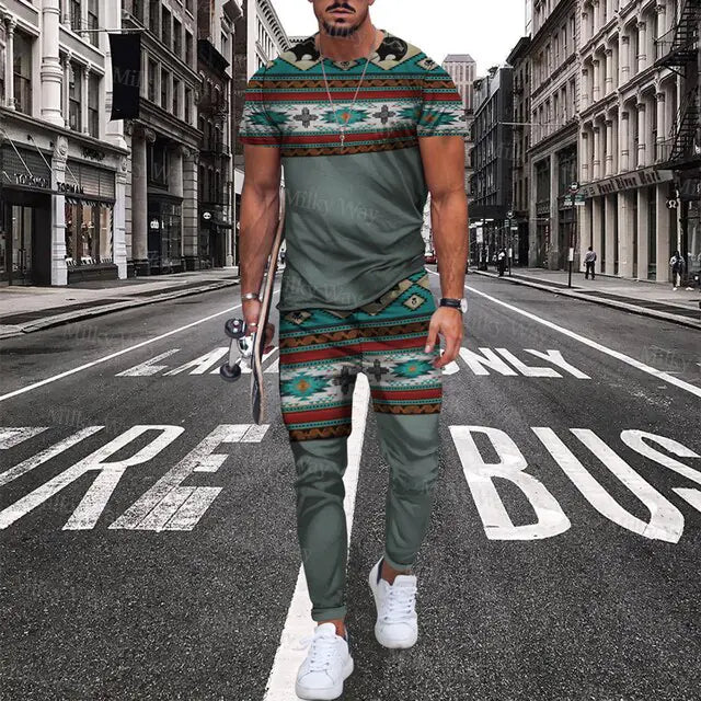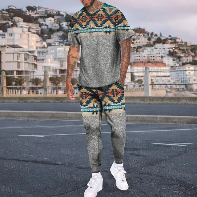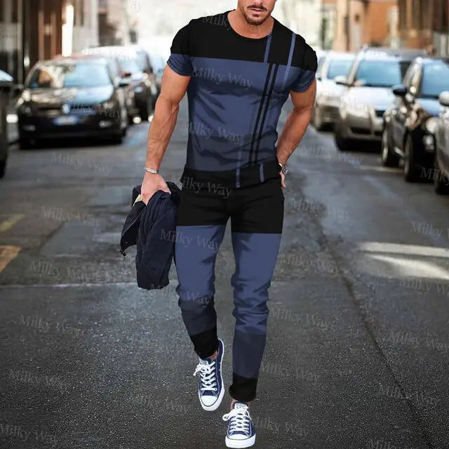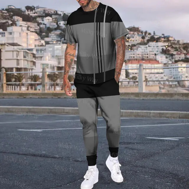 Men's Summer Tracksuit Stripe Print T-shirt Trousers Set