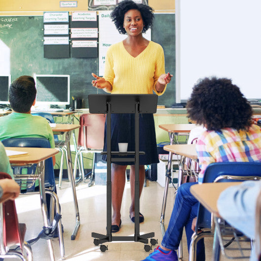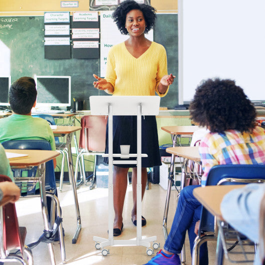 Mobile Lectern Podium Height-adjustable Rolling Laptop Cart with Tilting Top Storage Tray-White