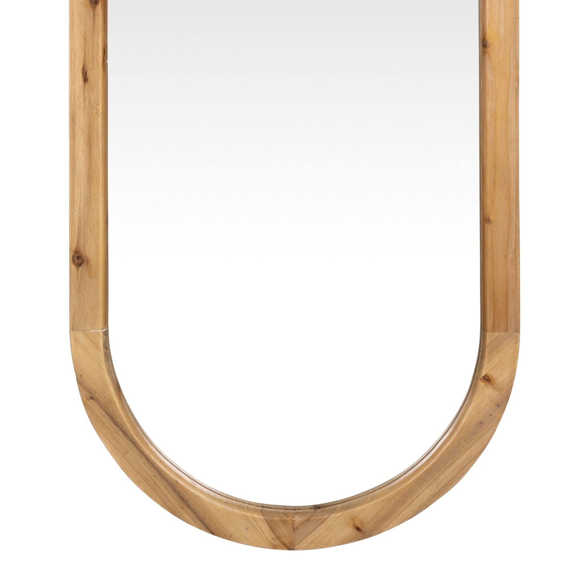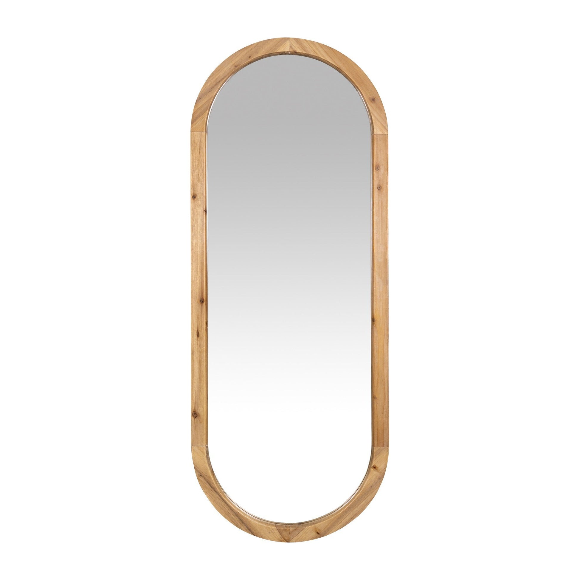 Bring in a sense of brightness and openness to any space in your home with this Oval Shaped Wooden Full Length Wall Mirror. The shape of the mirror is a narrow and long oval with straight edges and a curved top and bottom. The frame is made from wood and is finished with a clear lacquer to allow the wood grain to show through. Inside the mirror follows the same shape. This mirror can be used as a decorative mirror or you can use it in your vanity room to do any last minute outfit checks when heading out. This mirror can also be used to open up a smaller room and make it feel much more brighter and spacious. 49" H x 19" W x 1" D
