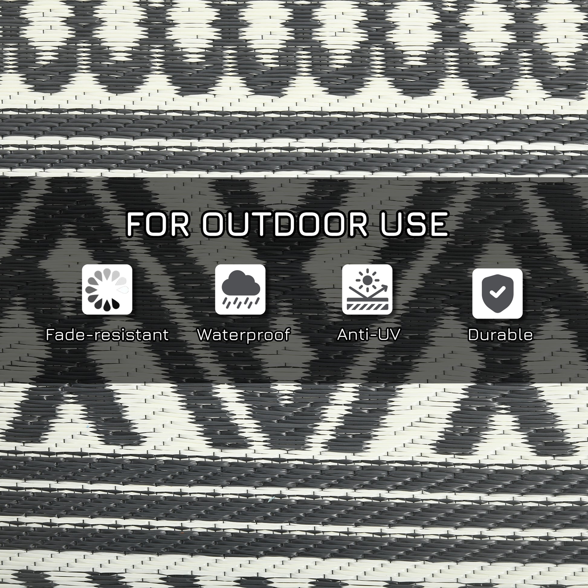 Camp on a carpet with Outsunny. This porch rug is designed to handle dirt. Outdoor-ready, our rug really cleans up fast; sweep, spray, wipe, or wave it; its powerful polypropylene fibers stay dry and don't saturate. Keep an outdoor rug in the camper, RV, or car; it's excellent for camping, beach trips, patio picnics, or anywhere outside. The color is reversible, meaning you can flip our plastic rug over for a fresh side or style. Upholster the outdoors with Outsunny. Features: - Reversible with double sides for varied use - Made of polypropylene, with a protective coating to help prevent fading and sun damage - Features robust edging to prevent fraying - Space-saving foldable design for easy storage and transport - Carry bag included - Versatile for camping, picnics, RV road tours, and more Specification: - Color: Gray and Cream White - Style: Boho - Materials: 310g/m² Polypropylene, Non-Woven Fabric - Dimensions: 215.7" L x 107.9" W - Carry Bag Dimensions: 36.6" L x 13.4" W x 7.5" H - Item Label: 844-807V01MX - Note: Not fireproof, keep away from fire Package Includes: - 1 x Outdoor Rug - 1 x Carry Bag Camp on a carpet with Outsunny. Features: - Reversible with double sides for varied use - Made of polypropylene, with a protective coating to help prevent fading and sun damage - Features robust edging to prevent fraying - Space-saving foldable design for easy storage and transport - Carry bag included - Versatile for camping, picnics, RV road tours, and more Specification: - Color: Gray and Cream White - Style: Boho - Materials: 310g/m² Polypropylene, Non-Woven Fabric - Dimensions: 143.7" L x 107.9" W - Carry Bag Dimensions: 28" L x 12.6" W x 7.5" H - Item Label: 844-807V00MX - Note: Not fireproof, keep away from fire Package Includes: - 1 x Outdoor Rug - 1 x Carry Bag Camp on a carpet with Outsunny. Features: - Reversible with double sides for varied use - Made of polypropylene, with a protective coating to help prevent fading and sun damage - Features robust edging to prevent fraying - Space-saving foldable design for easy storage and transport - Carry bag included - Versatile for camping, picnics, RV road tours, and more Specification: - Color: Gray and Cream White - Style: Boho - Materials: 310g/m² Polypropylene, Non-Woven Fabric - Dimensions: 120.1" L x 95.7" W - Carry Bag Dimensions: 24.4" L x 12.6" W x 5.5" H - Item Label: 844-807V02MX - Note: Not fireproof, keep away from fire Package Includes: - 1 x Outdoor Rug - 1 x Carry Bag.