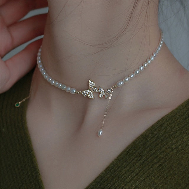 Elevate your style with our Rhinestone Butterfly Pendant Pearl Necklace. This exquisite piece of jewelry is designed for women and girls, featuring a vintage and baroque-inspired clavicle chain with a dazzling rhinestone butterfly pendant. The addition of pearls adds a touch of elegance to this necklace, making it perfect for special occasions or as a thoughtful jewelry gift. Embrace timeless beauty and charm with this vintage-inspired pearl necklace that complements any outfit.