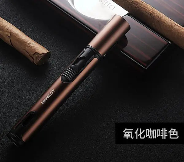 Introducing the Turbo Spray Gun Tobacco Lighter—a game-changer for smokers seeking reliability, portability, and durability. Crafted specifically for tobacco enthusiasts, this lighter sets a new standard with its cutting-edge technology and user-friendly design. Experience the power of the state-of-the-art blue flame, meticulously engineered to efficiently ignite cigars and cigarettes of any size with precision and ease. Say goodbye to wasted gas and frequent refills thanks to its optimized fuel efficiency. Designed for all environments, this lighter defies wind and weather, ensuring a flawless smoking experience no matter the conditions. Its compact size and included accessories make it a standout among its peers, offering unmatched convenience wherever you go. Crafted with attention to detail, its sleek design not only catches the eye but also boasts a sizeable fuel tank, guaranteeing continuous use over extended periods. From outdoor gatherings to everyday enjoyment, the Turbo Spray Gun Tobacco Lighter is the ultimate companion for smokers who demand style, efficiency, and safety in one impressive package.