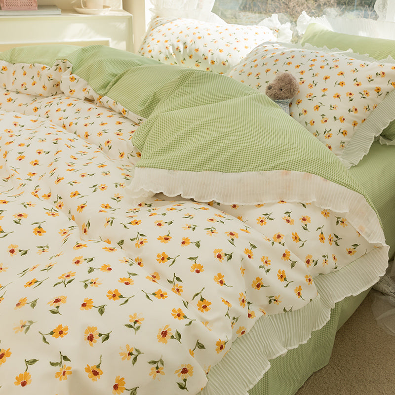 Washed Cotton Small Floral Quilt Cover, Four Piece Bed Sheet Set